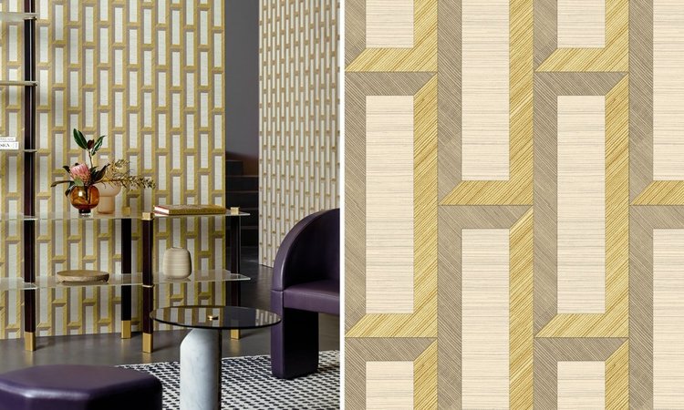 Biseau wallpaper is inspired by a decorative frame with mitered corners. The diagonal inlays stand out against the light, horizontal background. The different directions of the sisal weave create an unparalleled 3D effect. This wallpaper is fire retardant.
