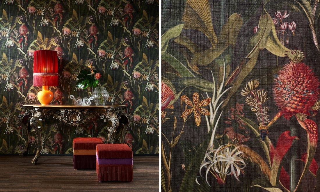 Blooming Pineapple wallpaper from Arte. This wallpaper is full of tropical flowers and plants from the South African sugar bush. The leopard flowers and blooming pineapples take you on an exotic journey through Africa. Made in a linen effect. This wallpaper is fire retardant.