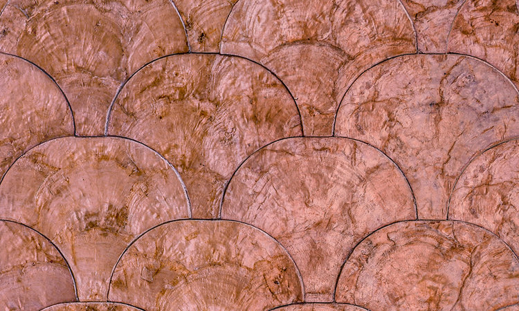 Camber wallpaper from Arte. This wallpaper is made of real shells. The shells are geometrically laid out in a pattern. The color nuances of the mother-of-pearl vary depending on the incidence of light and give a fanatical luxurious look.