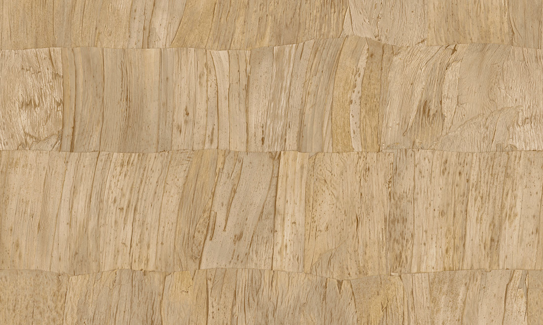 Capas wallpaper is a vinyl wallpaper inspired by inlaid dried banana leaf. The overlapping banana leaves create a calm whole because the strips are unrecognizable. This faux uni charms with its tiling composition and the soft, pronounced relief.