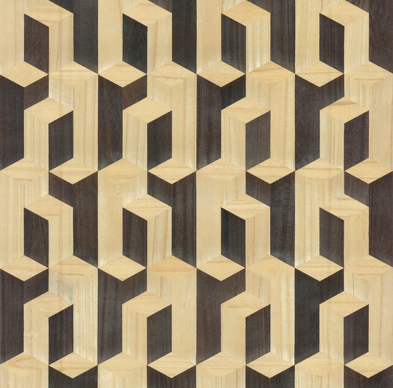 This wallpaper from ARTE is made of wood and shows a combination of horizontal surfaces and upright beams in a contrasting color. Marquetry at its best, like skyscrapers against the sky. The sense of depth with this pattern is immense. An eye-catcher of size.