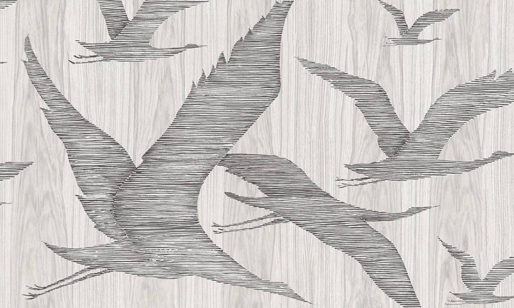 The wallpaper ARTE Hover has a design of flying birds inlaid in a wood veneer look (glossy).