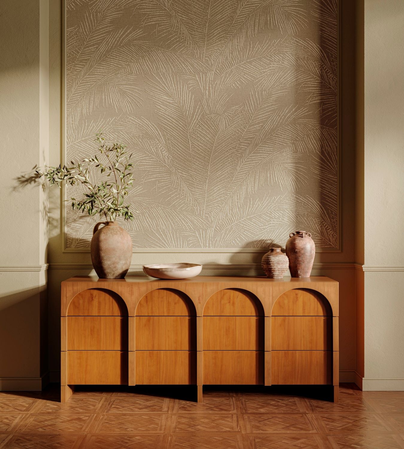 An enchanting wallpaper collection with an exotic twist, named after the Hawaiian word for veranda. Each design was designed by hand, with rattan and raffia inlaid or embroidered with extreme care. A vinyl version was also made of this artisanal splendour that comes to life in fresh, natural colour combinations.