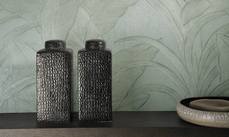 Musa is a wallpaper with a botanical design of large shiny leaves. This wallcovering from ARTE has an exotic print with a lush appearance due to the metallic shine. A luxurious wallpaper that is perfect for a natural, glamor and chic interior.