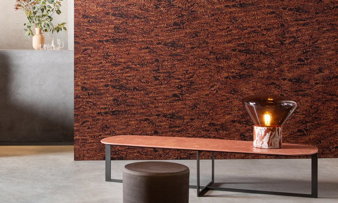 Orizzonte wallpaper has a weathered yet warm appearance due to the luxurious bouclé fabric. The horizontally woven multicolor threads give the pattern depth and relief. The visible metal threads give the fabric a subtle shine. This wallpaper is fire retardant.
