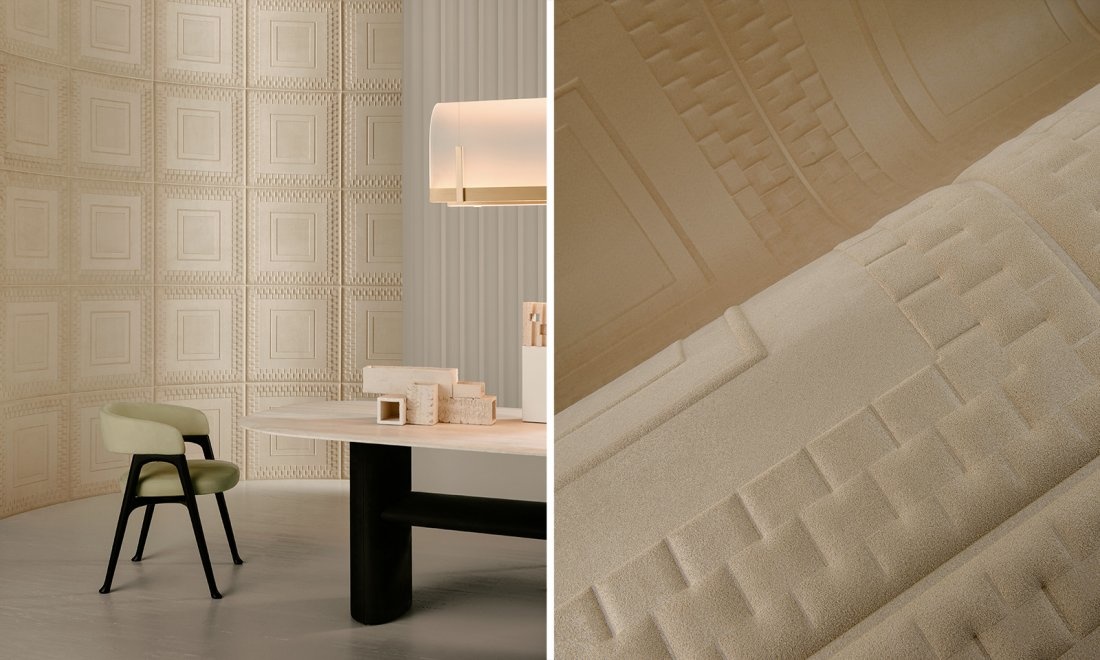The Pantheon's coffered ceiling inspired this design. This structure was used by the Romans to illuminate the vaulted structures of domes and ceilings. In addition to color and texture, Pantheon also adds relief to the wall. It is finished with a soft suede look for a more tactile effect. This 3D wall covering also benefits the acoustics of a room and is fire retardant.