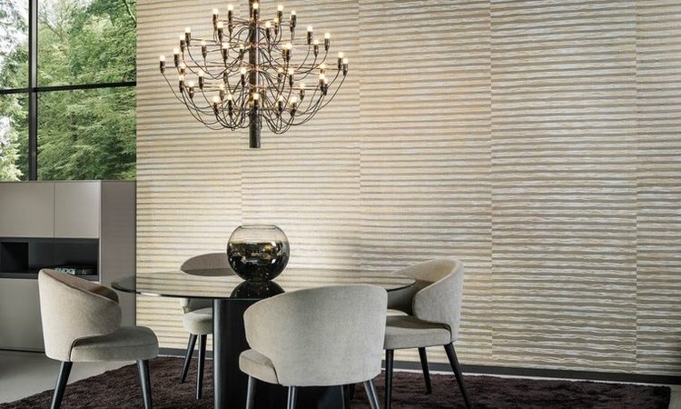 Raphia wallpaper consists of a combination of raffia and raw thread, irregularly woven to emphasize the natural character. Both matt materials contrast beautifully with the metallic or lacquered surface.