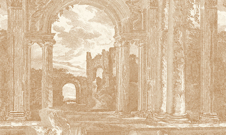 Rovine is a stately panorama wallpaper with an etching of a Greek ruin. This vinyl wallpaper shows a classic drawing of ancient Greek times in decline. The work is dedicated to Monsieur Descamps, one of the king's artists. This wallpaper is fire retardant.