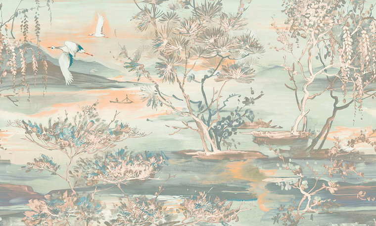 ARTE Sagimai wallpaper, a toile-like motif with beautiful flowering trees, layered mountain peaks and cranes in flight. With this wallcovering you provide your walls with beautiful Japanese painting. Create a special atmosphere and dream away with this Japanese definition of beauty. The grass fabric that has been pasted on this wallpaper gives a tangible structure and emphasizes the Japanese appearance. This wallpaper has a subtle shine when the light hits it.