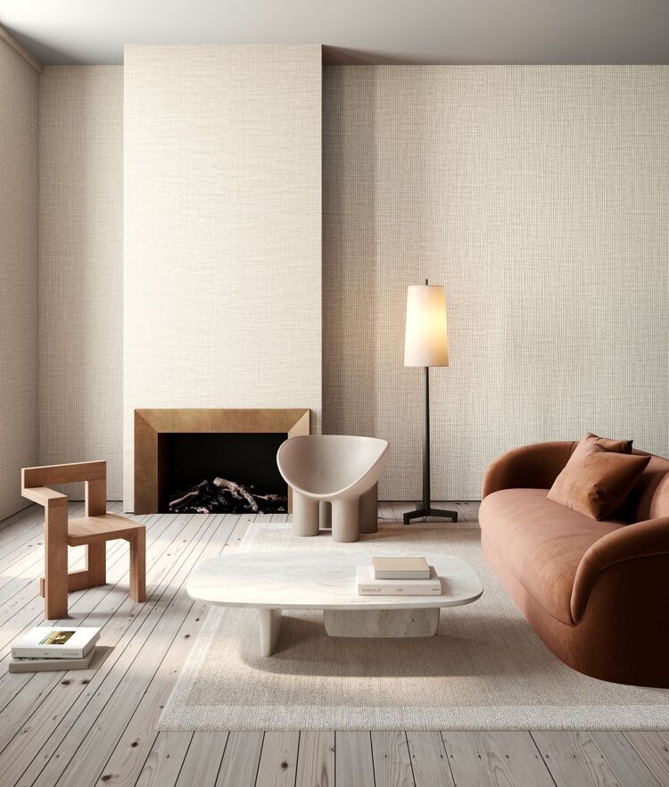 The collection features three plain textures, each offering a refined interpretation of high-quality woven wool. Rendered in soft, natural tones, these designs provide a stylish and warm foundation for any space. They also combine effortlessly with more industrial materials like glass, metal, or concrete, creating a sophisticated and balanced contrast.