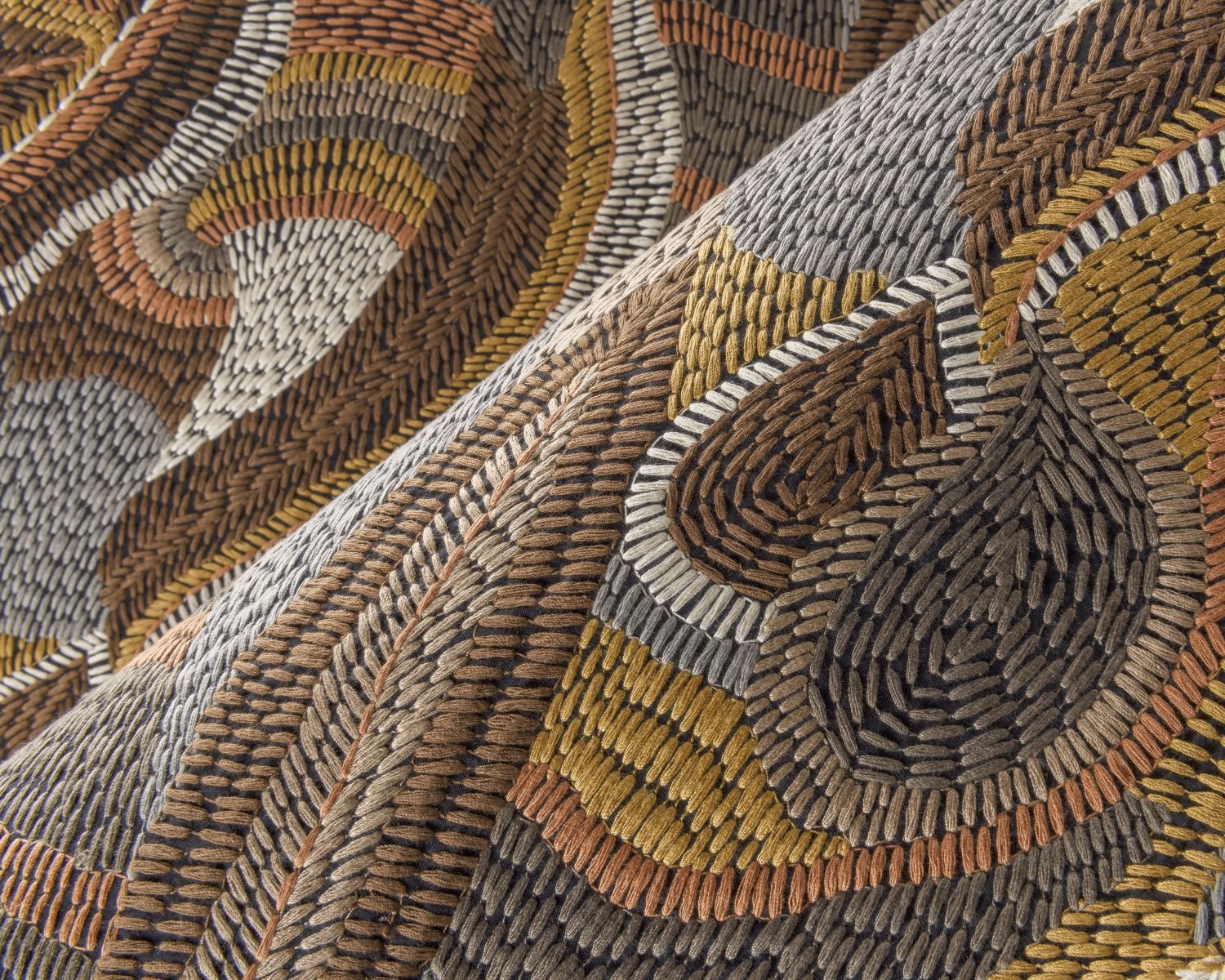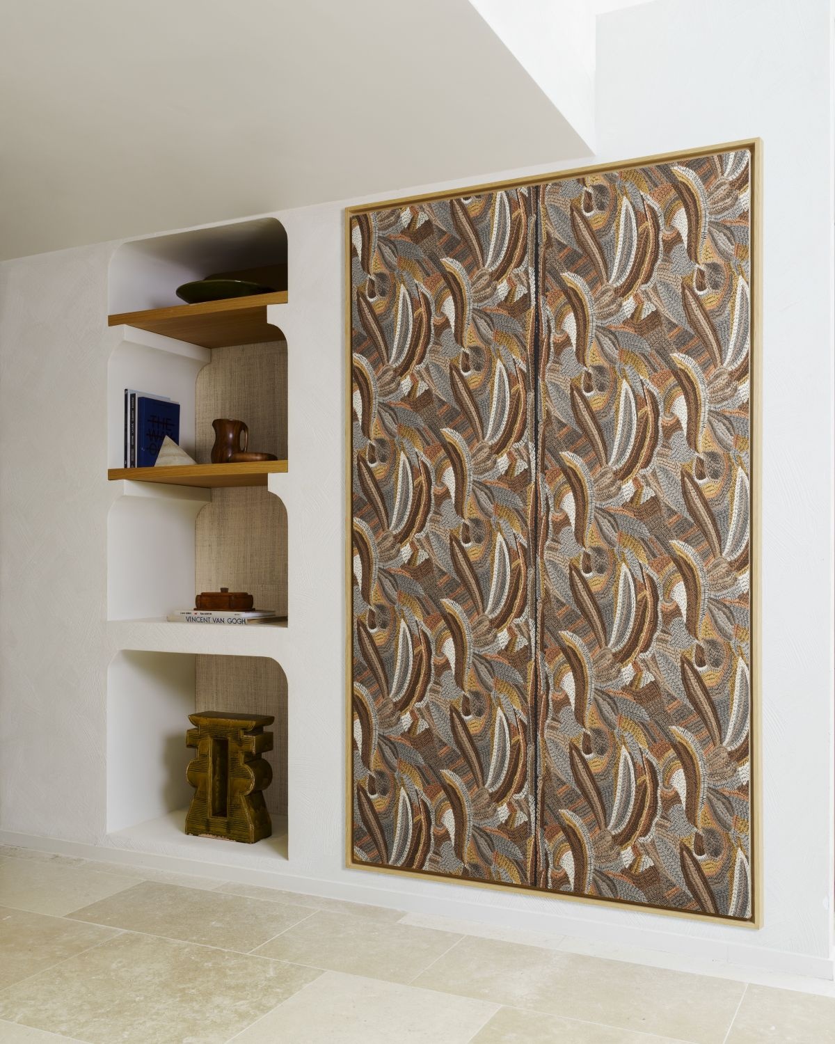 Mandrava is a superb example of craftsmanship with the textile being covered with a dense embroidery featuring an intriguing floral pattern. This artwork was named Mandrava, after the Malagasy word for ‘foliage’.