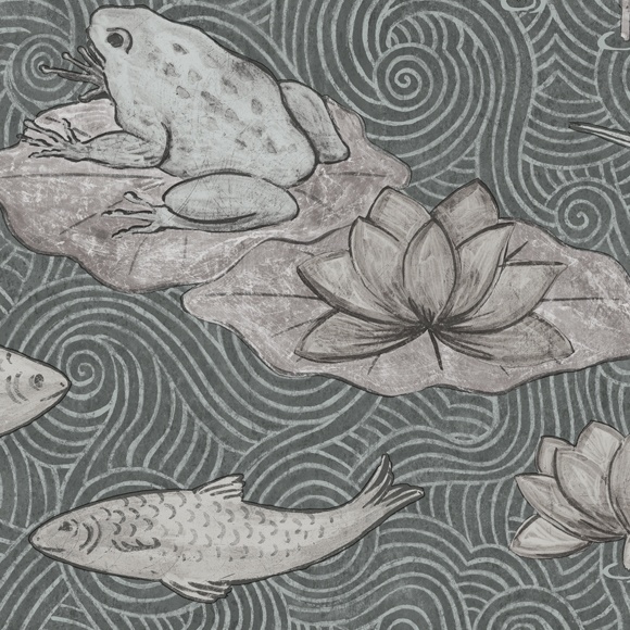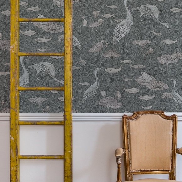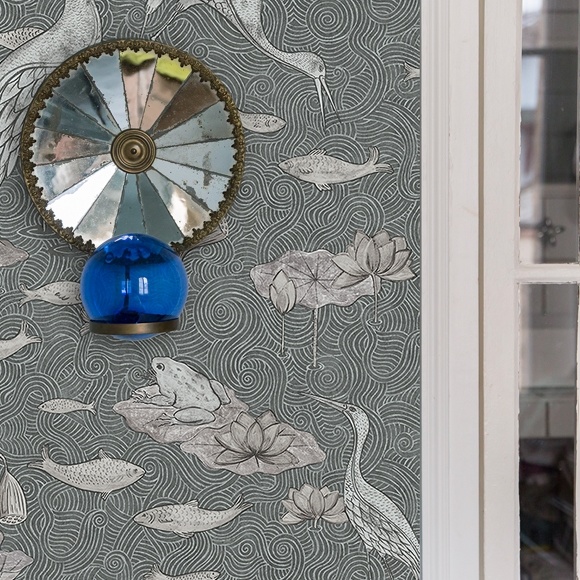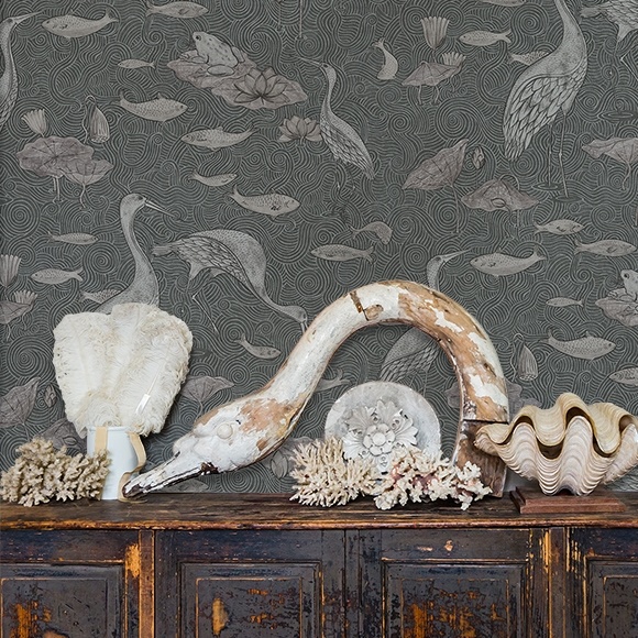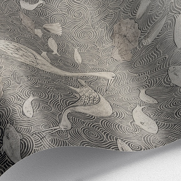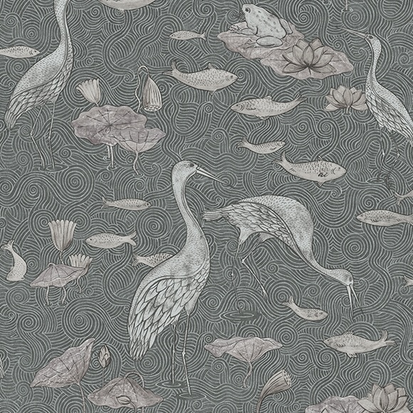 Non-woven wallpaper with metallic reflections representing silver-gold herons surrounded by fish, frogs and water lilies in a stylized black and white pool. Available in 5 colors.