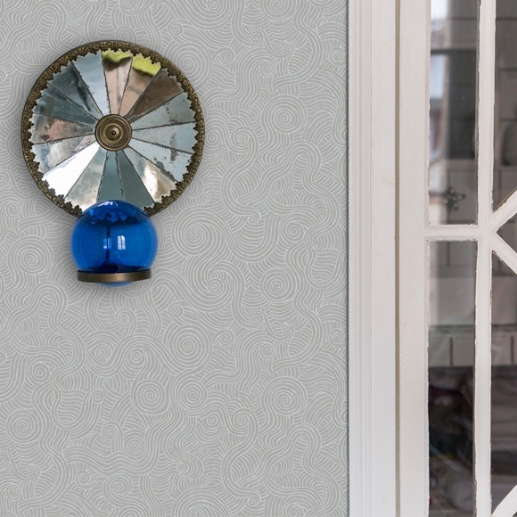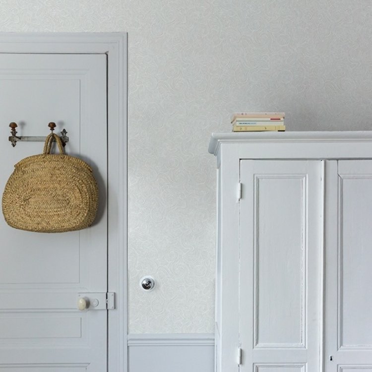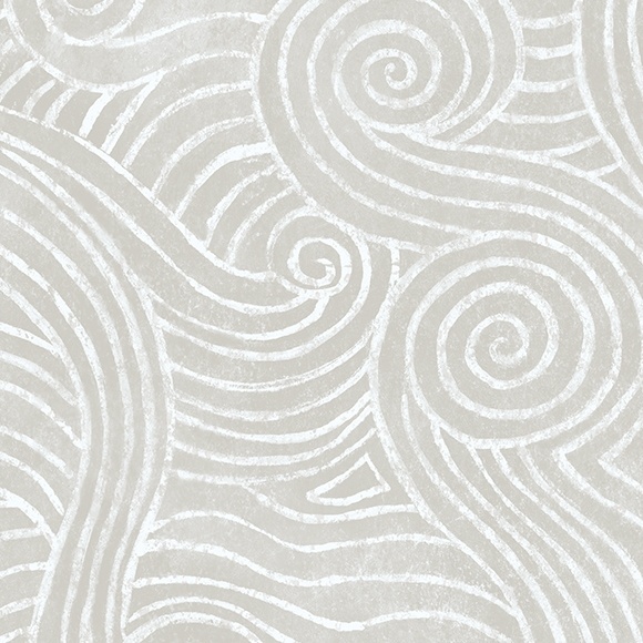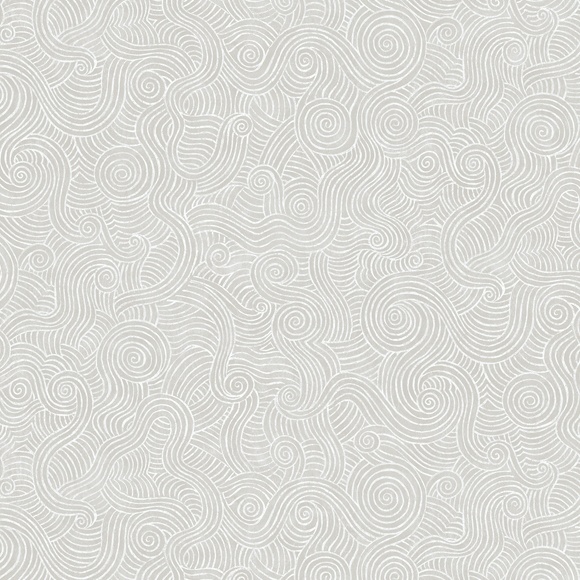 Graphic non-woven wallpaper representing in a stylized way the undulations of a pond, here in white on a light gray background.