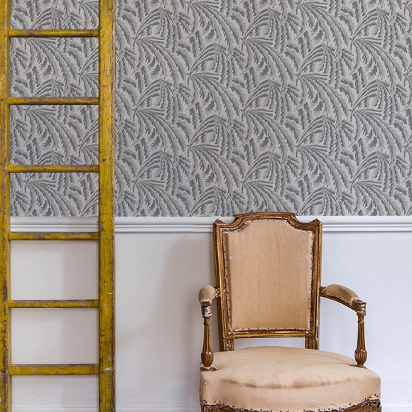 Non-woven vegetable wallpaper representing willow branches in an Art Deco style, here light beige and dark beige.
