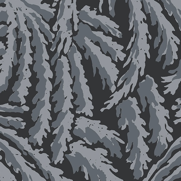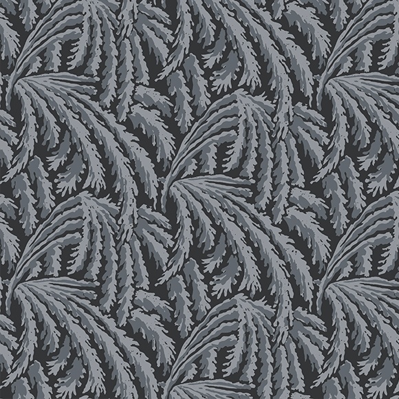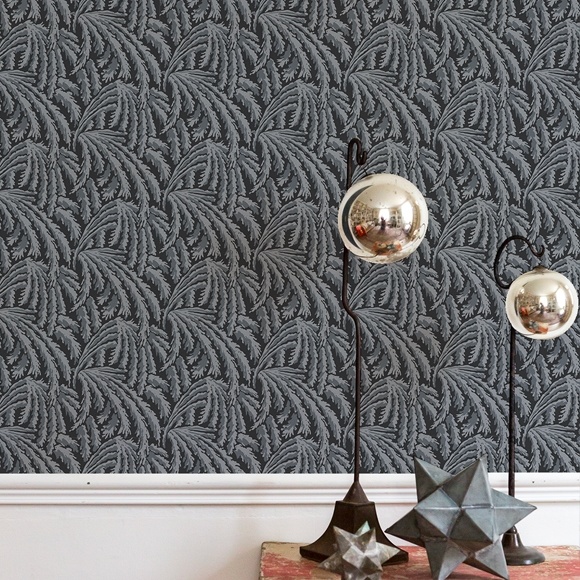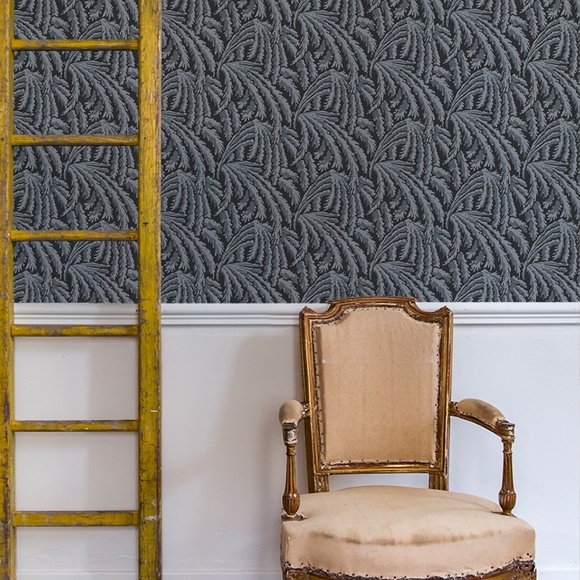 Non-woven vegetable wallpaper representing branches of light gray and dark gray willow in an Art Deco style on a black background.