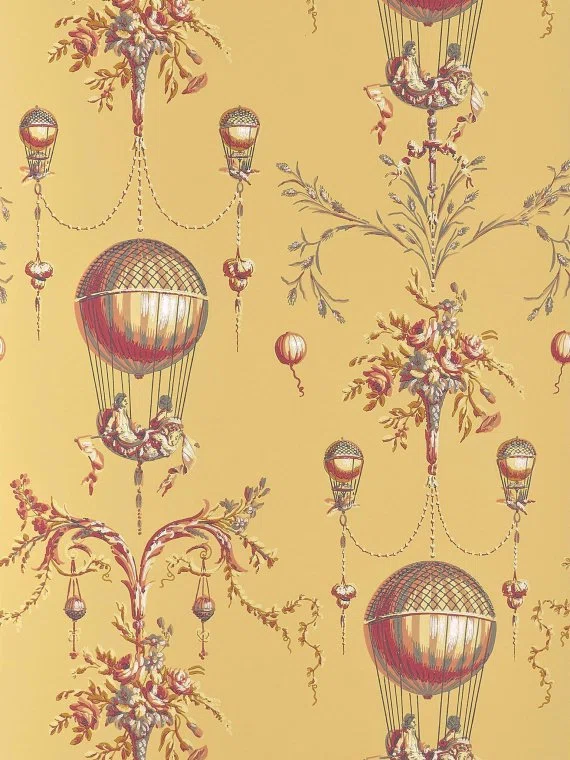 La Roziere is a wallpaper that is inspired by the historical drawings of the first hot air balloons. This wallcovering from Braquenié, from the Pierre Frey Braquenié Collection Anniversaire 1823, shows the balloons in a fantastical setting, filled with guirlandes and rich bouquets of flowers. A timeless panel wallpaper that is perfect for a luxe, chic and exclusive interior.