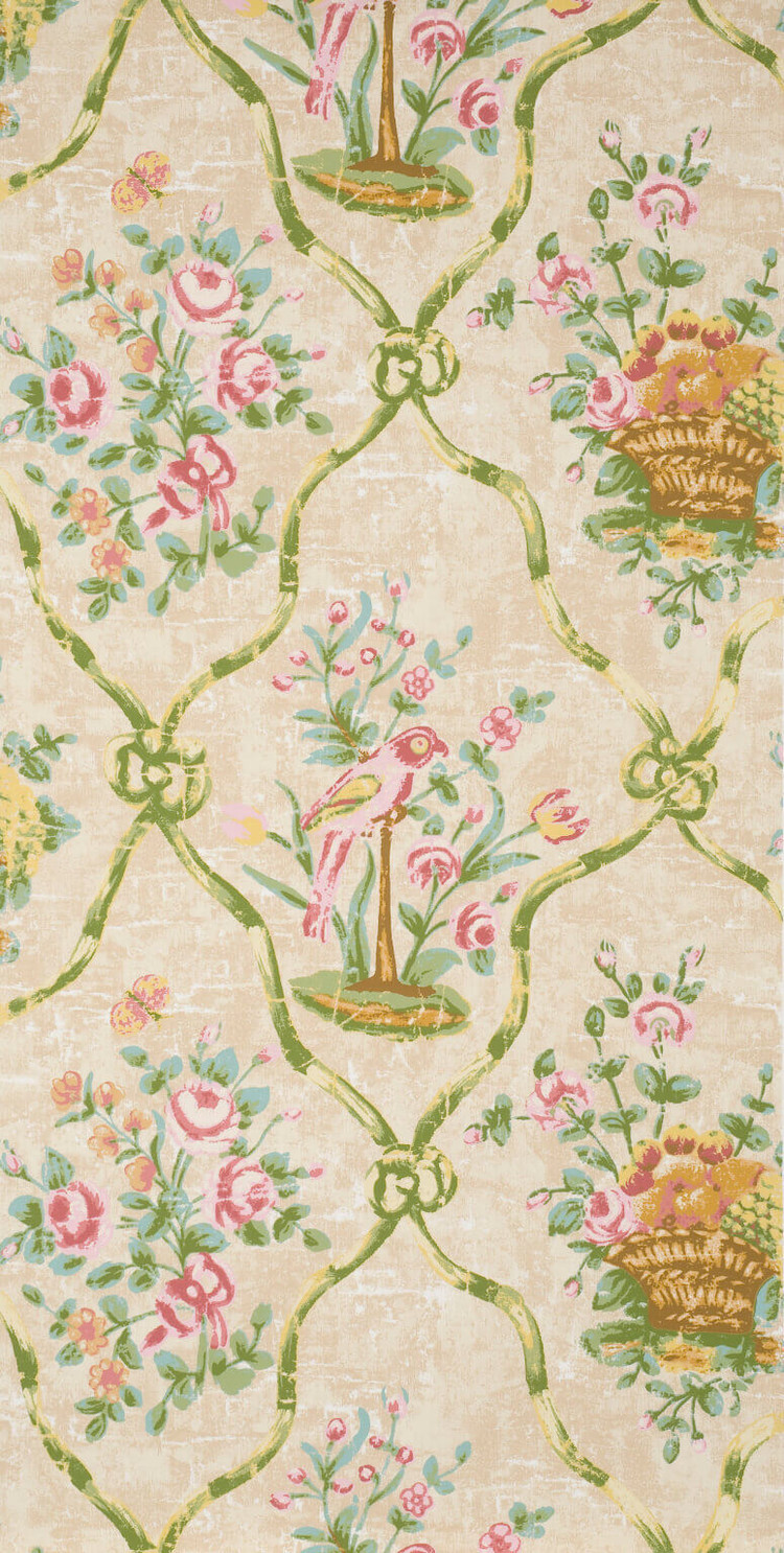 Painted cloth representing intertwined ribbons, birds and bouquets.