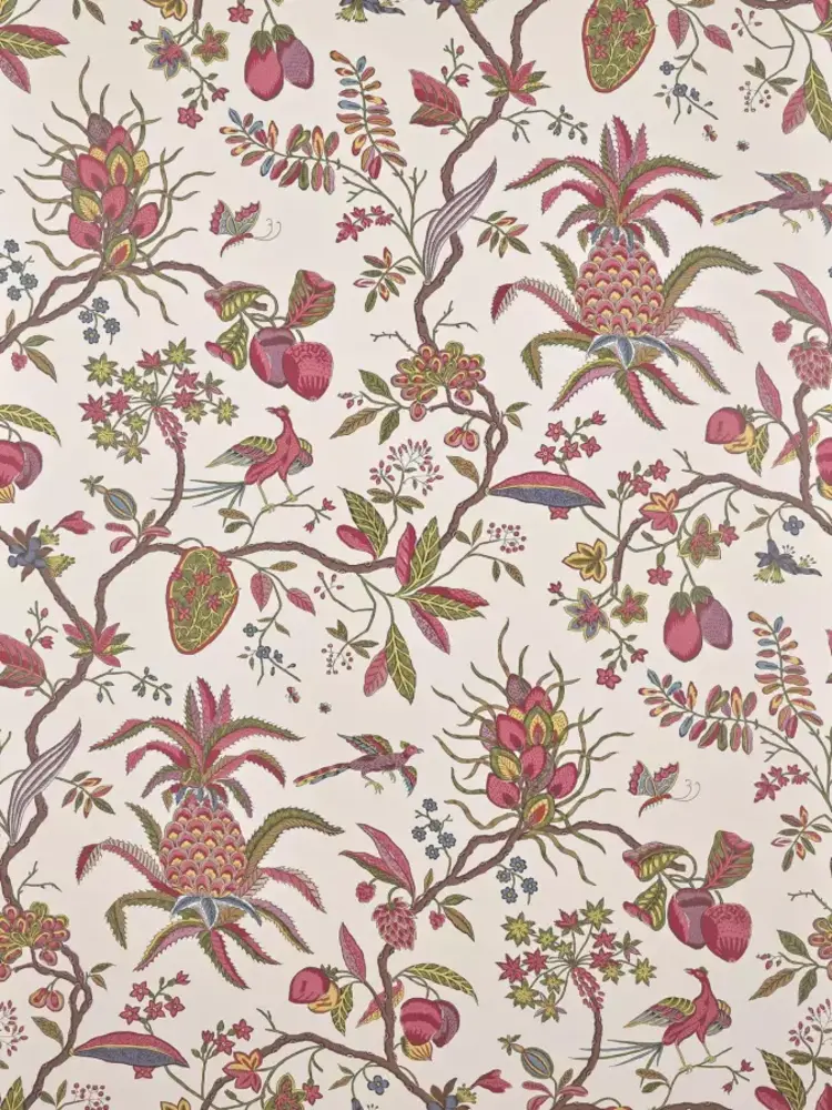 Petits Appartements De La Reine is a wallpaper that is inspired by a historical drawing that is called 'Ananas', meaning pineapple. This wallcovering from Braquenié, from the Pierre Frey Braquenié Collection Anniversaire 1823, shows the fruit in the midst of flowers, leaves, branches and birds. A timeless panel wallpaper that is perfect for a luxe, chic and exclusive interior.