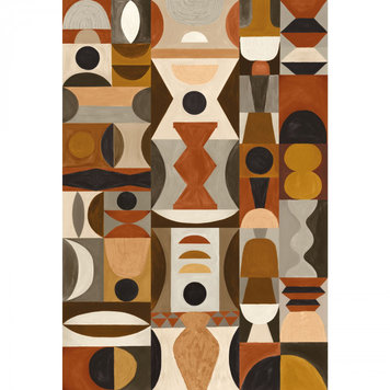Modelage panel wallpaper. Planned by our design studio, this wall panel is an imaginative walk around a spot washed in daylight. It gives an overview of the workshops in the Midi region of France, a gathering place for craftsmen motivated by the sun making shapes and shadows. Created using banner paint, showing soil to frame the material into some sort of shapes and completed with a stroke of the paintbrush.