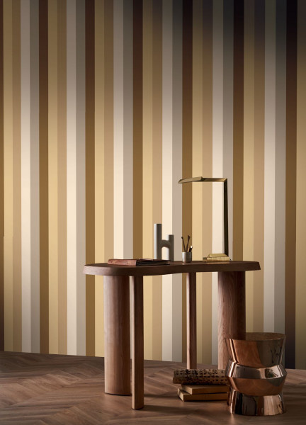 Transat is a wallpaper with vertical stripes. The Casamance wallcovering from the L'Île Aux Oiseaux collection brings together new colors such as sorbet and honey. Some variants are completely matte, while others have a bronze color made with metallic ink. Bold color combinations inspired by the Cap Ferret palette and a beautiful wallpaper that is perfect for a beach vibe and colorful interior.