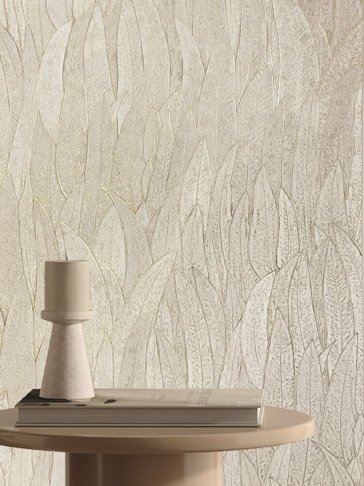 The Nature Précieuse collection is based on an innovative technique in which a metallic foil is applied to the relief of the texture. In a perfect symbiosis, the plant print and gold melt into each other, offering your interior the most precious jewel box.
