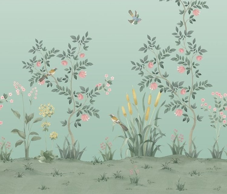 The Chinelle wallpaper Tres Tintas has a cheerful chinoiserie design of beautiful branches that seem to grow out of your floor. The botanical representation also has cheerful birds flying around between the leaves. The design of this panel wallpaper is by the Spanish designer Sophia Pegas.