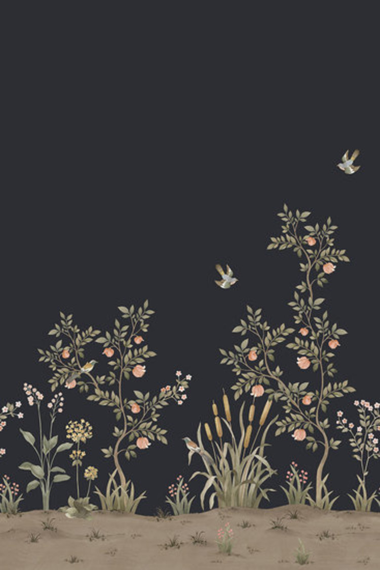 The Chinelle wallpaper Tres Tintas has a cheerful chinoiserie design of beautiful branches that seem to grow out of your floor. The botanical representation also has cheerful birds flying around between the leaves. The design of this panel wallpaper is by the Spanish designer Sophia Pegas.