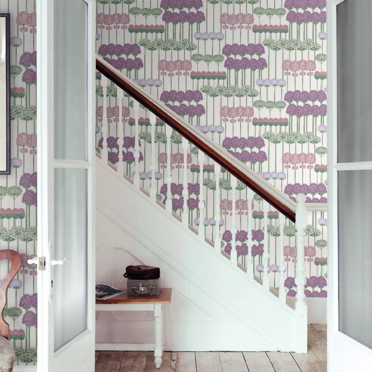 A contemporary, geometric take on the traditional floral motif, Allium takes the striking herbaceous perennial and creates a bold repeat of blooming clusters. With their firework burst of colour and texture, the allium spheres of flora, combined with their long, leafless stems, makes a unique floral stripe, in inspiring seasonal tones of summer Mulberry, Blush & Lilac on White, and Coral & Leaf Green on Charcoal, alongside wintery Teal & Jade on White, and Mulberry & Heather on Violet.