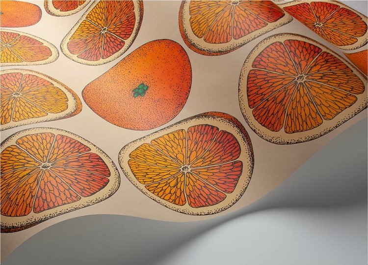 The bold repeat of Mediterranean citrus fruits seen in Arance are a prolific theme throughout the Fornasetti archive, originally appearing on the tray 'Fette d'arancia' in the 1950s and repurposed by Barnaba Fornasetti in the 90s as a graphic fabric print. This organic study has been produced in true-to-life palettes of Blood Orange, Orange, and Lemon on strikingly contrasting grounds of chalky Seafoam and Stone, as well as the sumptuous Ink.