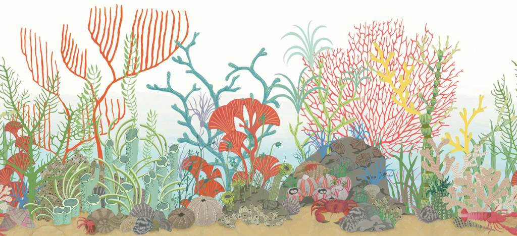 With its company of crustaceans and shells hiding amongst strange and wonderful waterworld plants and coral on a shoreline somewhere far away, this 68.5cm high frieze is perfect for adding an aquatic twist to any environment. The design repeats once every 1.5 metres on a 7.5 metre roll.