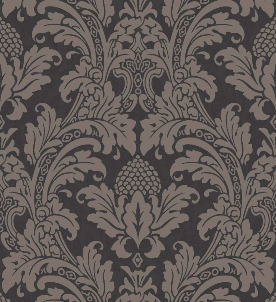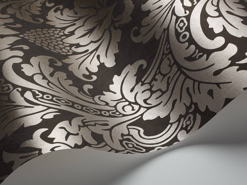 A classic surface printed damask wallpaper design, layered over subtly patterned grounds of deep red, rich gold, teal, graphite and pewter. Available in five colourways.