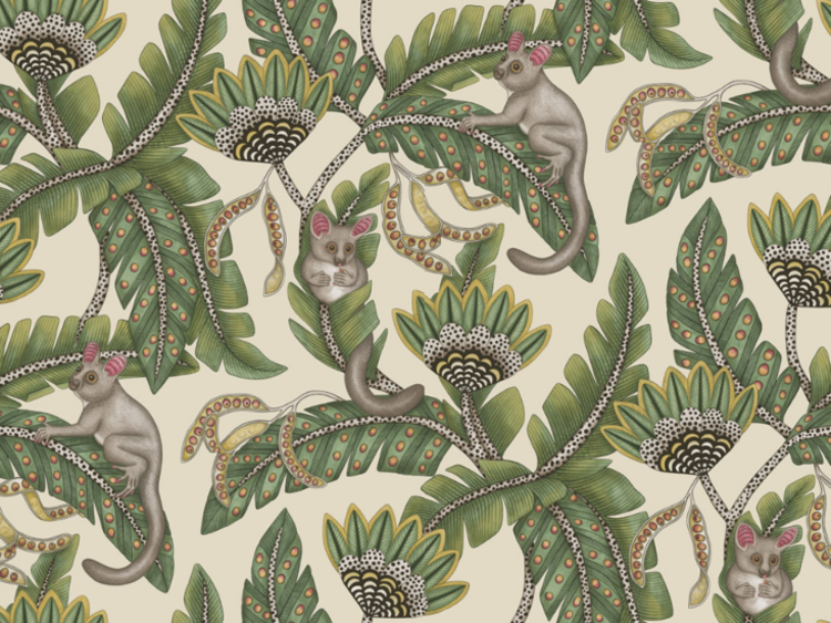 Adorable bush babies are a firm favourite throughout the Ardmore studio's work. Within Cole & Son's Bush Baby wallcovering they nestle in a canopy of leaves beside an African Coral, or "Lucky Bean" tree whose plump pods are bursting to reveal ripe seeds. With their alert ears listening for the flutter of insect wings, the bush babies are poised to leap upon a tasty snack, with rose-tipped fingers and a sliver of pink tongue.