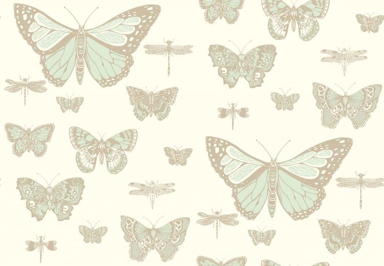 Taken from the Cole & Son archives this elegant design surprises with its scale. It features large graphical butterflies and dragonflies in shimmering metallic on cool neutral grounds, with the addition of a more unusual emerald green and gold on deep charcoal, and a bright pink on blue.