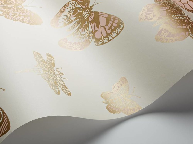 Taken from the Cole & Son archives this elegant design surprises with its scale. It features large graphical butterflies and dragonflies in shimmering metallic on cool neutral grounds, with the addition of a more unusual emerald green and gold on deep charcoal, and a bright pink on blue.