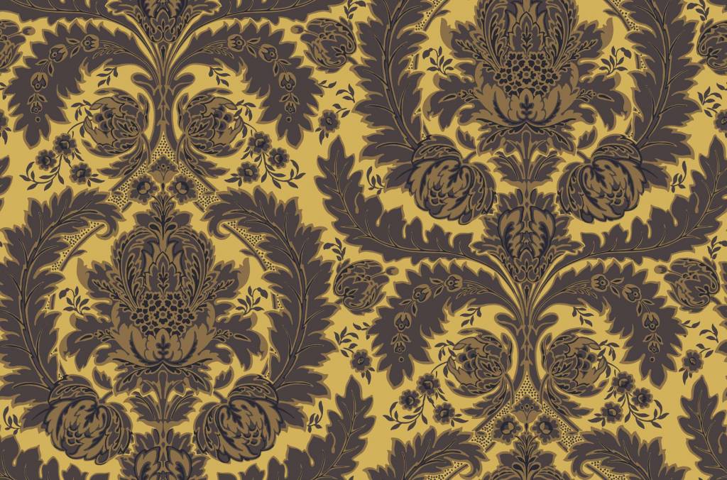 A popular wallpaper design from the Cole & Son archive re-coloured in chalky ground shades of stone, white, ochre and camel, with highlights of china blue, leafy green and sooty charcoal. A graceful pattern arrangement of leaves and budding flowers makes up this very handsome damask wallpaper. Available in five colourways.