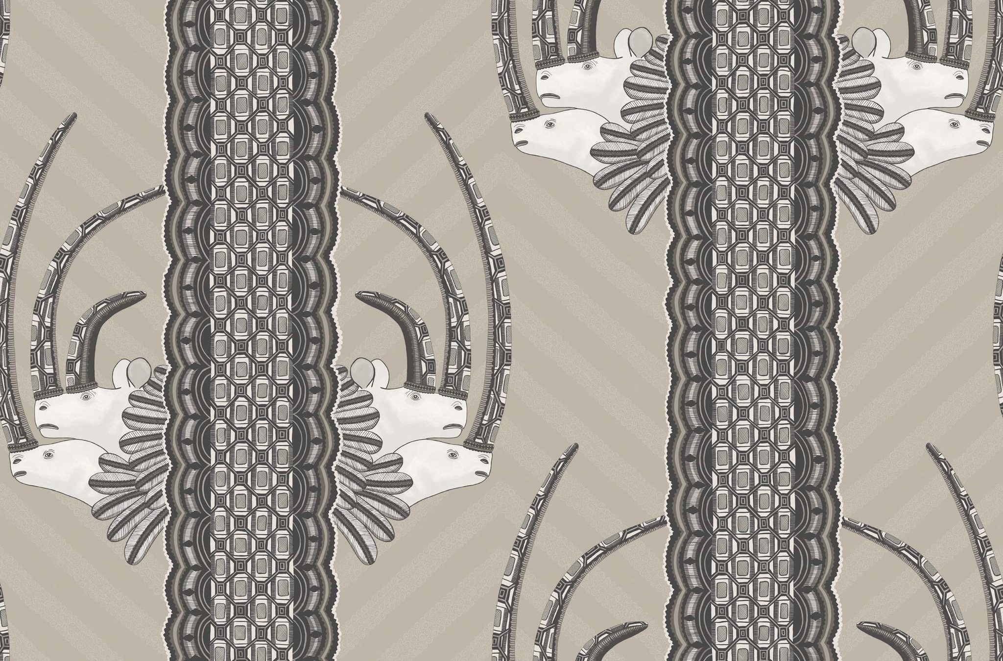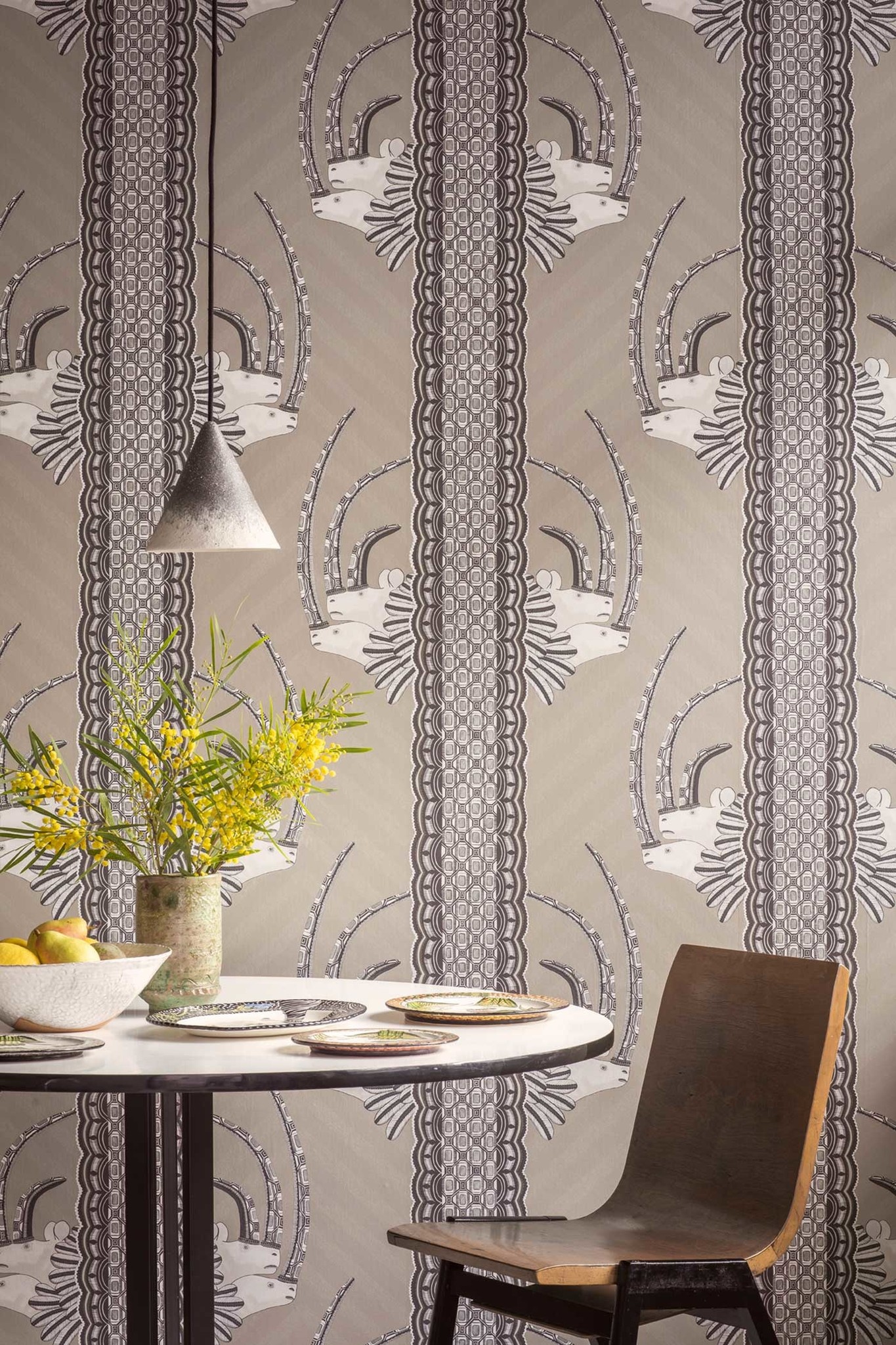 Named after one of Ardmore’s finest designers, Jabu Nene, this design takes its inspiration from the wonderfully sculptural rhino hand coiled vessels, created by sculptor Somandla Ntshanlintshali. These pots are then intricately painted in eye dazzling colours and patterns by Jabu Nene herself and now form a part of Ardmore’s most well loved signature styles. Our Cole and Son artists have used the markings on these pots to create a wonderfully rich and vibrant vertical stripe, out of which peek a pair of regal white rhinos complete with adorned horns and feathered ruffs. This wallpaper contains a true African spirit with its patterning reminiscent of Zulu basket weaving and is presented in five striking colourings, including sharp black, white and grey neutral tones alongside earthy olives, tobaccos and a tribal navy blue and orange.