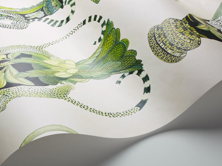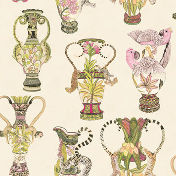 Khulu, meaning 'main' is a very appropriate name for this grand design of classic vases entwined with leopards, parrots, lions and other African animals. This fantastic wallpaper with its watercolor paintings pays homage to the famous ships recognized today by auction houses such as Christie's, Bonhams and Sotherbys as 'modern collectibles' and showcased in galleries and private collections around the world. The design is printed on an impressive 68.5cm repeat and is offered in four colorways including soft pinks and oranges on light cream, lots of Chinese blues on ivory, vibrant greens and charcoal on ivory and finally a dramatic petrol and emerald on night blue.