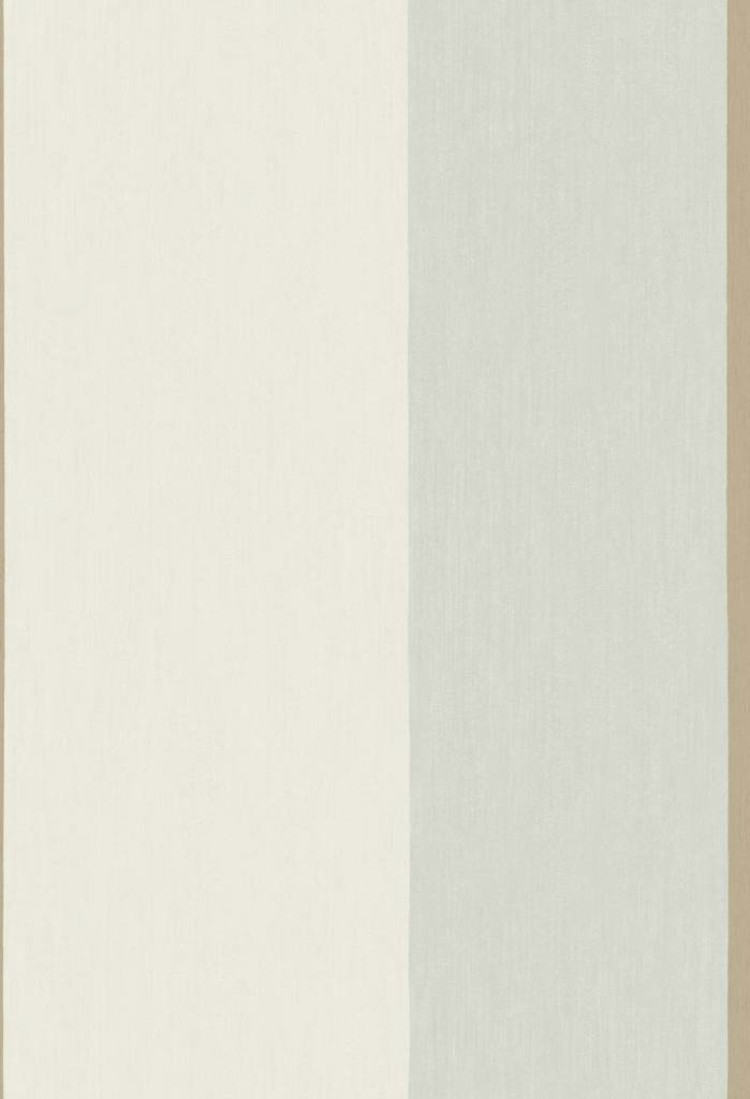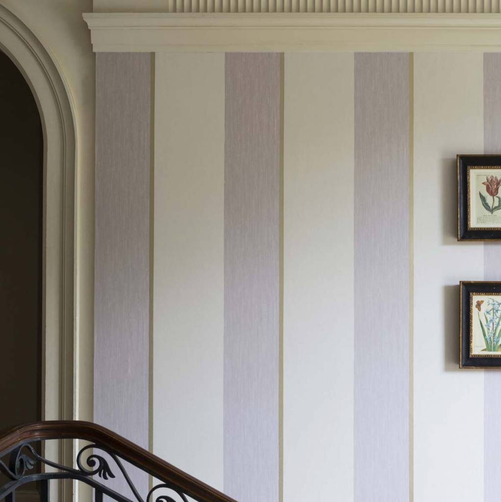 Named after the small royal residence of Louis XIV, the Marly wallpaper features an elegant wide painterly stripe of chalky hues of lavender, duck egg, yellow and pale blue decorated with thin ribbons of metallic gold, gilver and bronze. Lifestyle image shows lavender 99/13054.