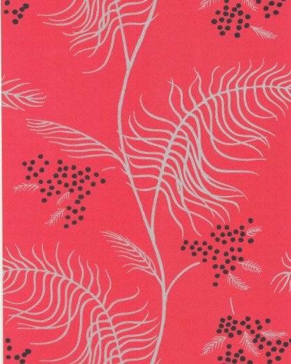 Vliesbehang uit de collectie New Contemporary II van Cole & Son. Patroon Mimosa (698130) met plant, tak en blad in kleur rood, zilver en zwart.