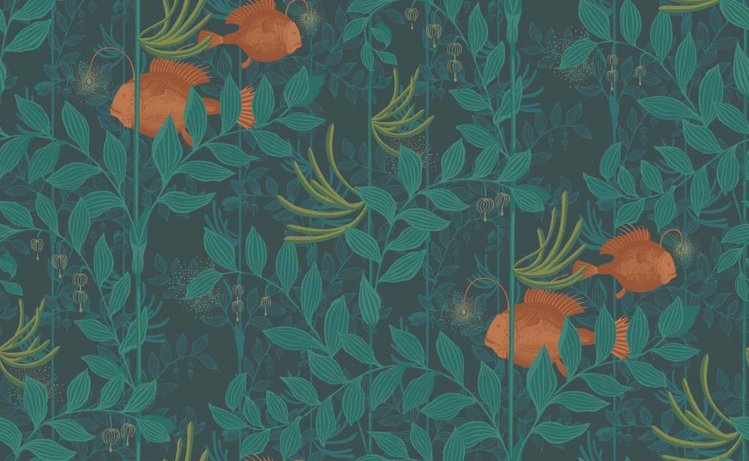 This charming design stars a pair of enigmatic anglerfish shimmering in a dreamlike landscape of underwater plants and tendrils. Presented in four colourings of soft olive and pink, subtle neutral and gilver, striking green and orange and deep indigo and yellow, Nautilus, like its namesake reveals a magical underwater world within a world.