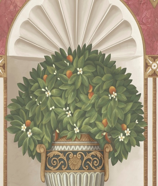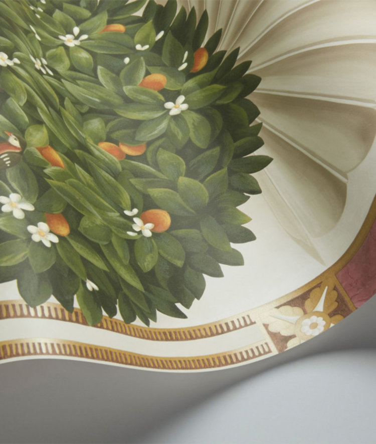 Depicting one of King William lll and Queen Mary ll’s blossoming orange trees, Royal Jardinière is a print featuring elements originally conceptualised by master artist Antonio Verrio. The King’s Little Bedchamber at Hampton Court Palace features orange trees in these ornate pedestals surrounded by opulent pink marble, giving its symmetrical structure a classical grandeur. The design celebrates the joint monarchs’ impressive collection of various rare plants from around the globe, known as the ‘Exoticks’ and also alludes to William’s ancestry, as a member of the House of Orange.