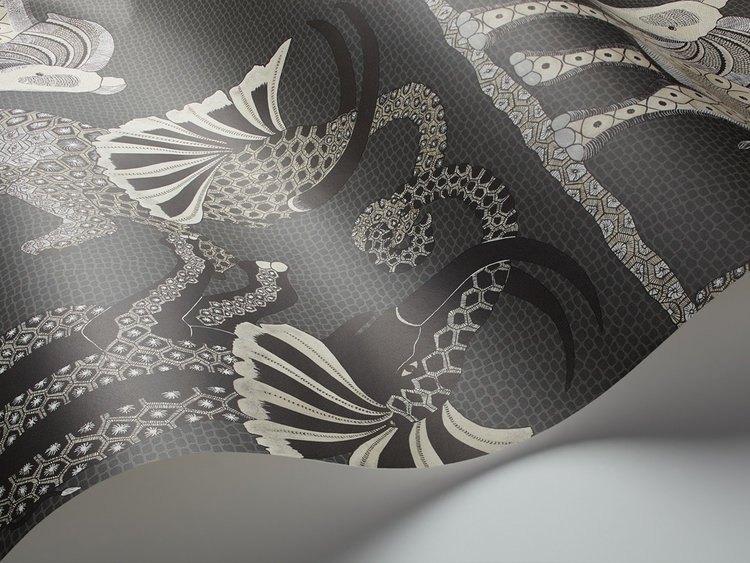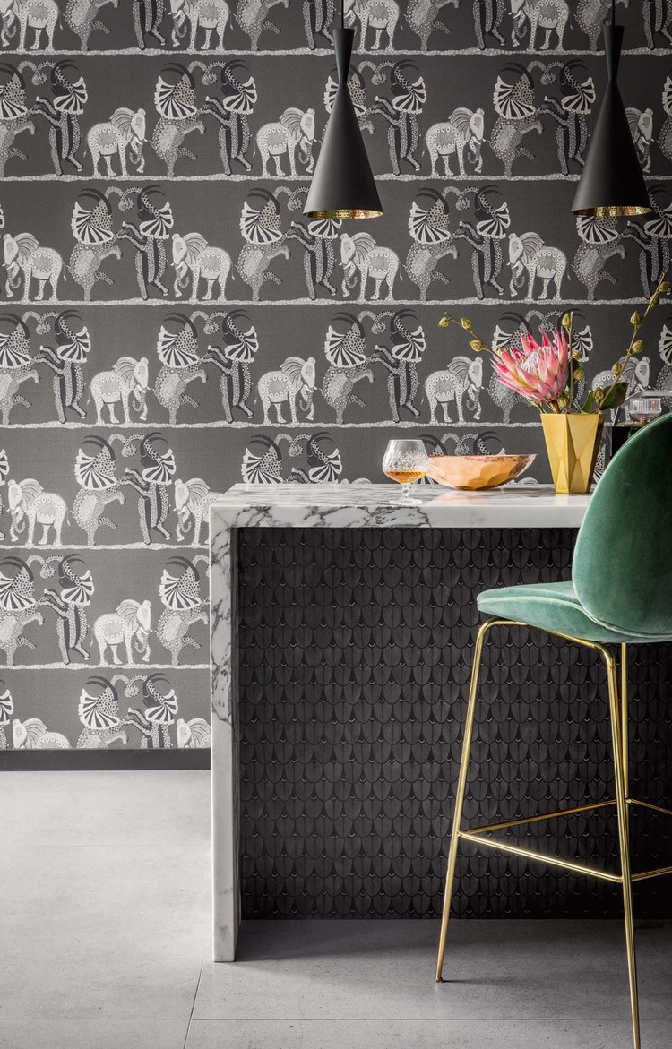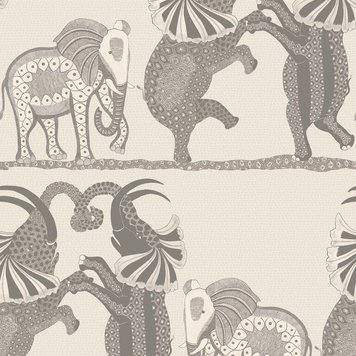 This wallpaper with a beautiful pattern shows three elephants dancing horizontally across the African plains. Intricately represented, they come from a series of large ornate urns painted by Zinhle Nene that feature prominently in the Ardmore Museum. The coloring has been kept quite simple to show off the fine hand-drawn elements - charcoal, sand and stone create a softly speckled background to black and white, soft mulberry and rust, and cool chalky grays.
