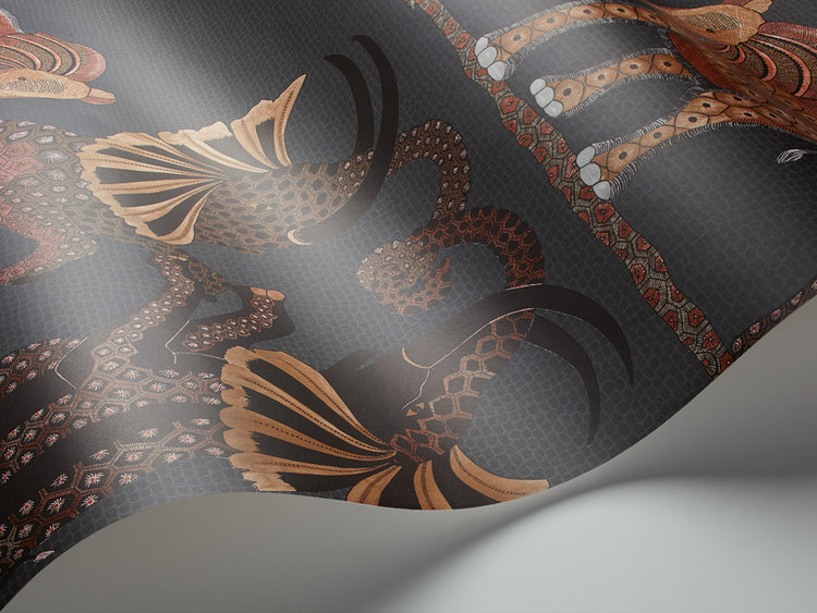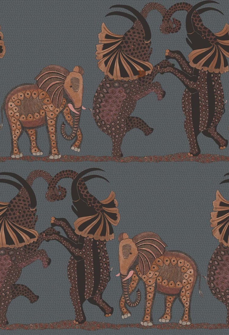 This wallpaper with a beautiful pattern shows three elephants dancing horizontally across the African plains. Intricately represented, they come from a series of large ornate urns painted by Zinhle Nene that feature prominently in the Ardmore Museum. The coloring has been kept quite simple to show off the fine hand-drawn elements - charcoal, sand and stone create a softly speckled background to black and white, soft mulberry and rust, and cool chalky grays.