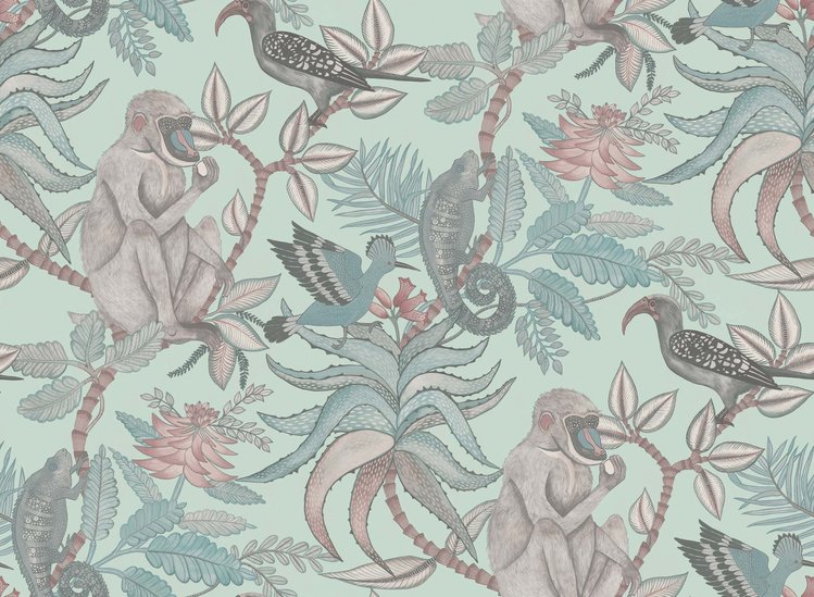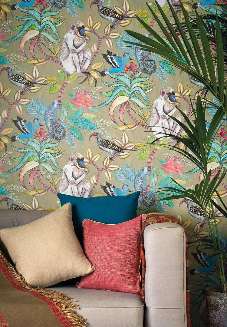 The Savuti is one of Africa’s most loved and well known national parks where hoopoes and hornbills call and sing whilst baboons and chameleons sun themselves in flowering Coral Trees. This wonderful African garden has been recreated as a wallpaper in seven colourful and distinctive colourings each offering a different look - a bright orange and charcoal with a monotone engraved feel – a duck egg and old stone with a more faded and antique illustrative tones, and a series of three brightly coloured more child-like colourings on grounds of cram, dark petrol and khaki.