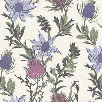 One of the many floral symbols of the British Isles, the unconventional beauty of the Thistle is in its graphic shape of spiny bracts and bursting rosettes. This bold trail design has been printed to reflect a screen print, with a chalky, matte finish to enhance the brittle shape of this stunning wild flower. Seasonal palettes of fresh Lemon & Olive on Duck Egg, muted Alabaster Pink & Orange on Parchment, and a hazy Lilac & Cerise on White enhance this striking motif of iconic blooms.