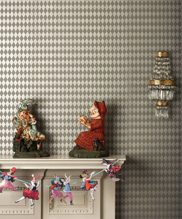 Comprising the classic and mysterious harlequin motif, this smart scale wallpaper is offered in five subtle neutral shades, teamed with soft textured metallics. Inspired by that most enchanting of Shakespearian dreams.