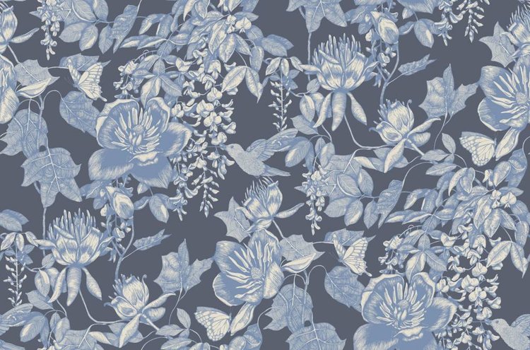 Taking its name from the Jardin de Tivoli in Paris. Finely drawn trails of flowers and stems trace their way over this delightful floral wallpaper, which also features delicately illustrated hummingbirds and butterflies within its leaves. Offered in in five shades of soft yellow, grey, old olive, indigo and coral. Lifestyle image shows indigo 99/7032.