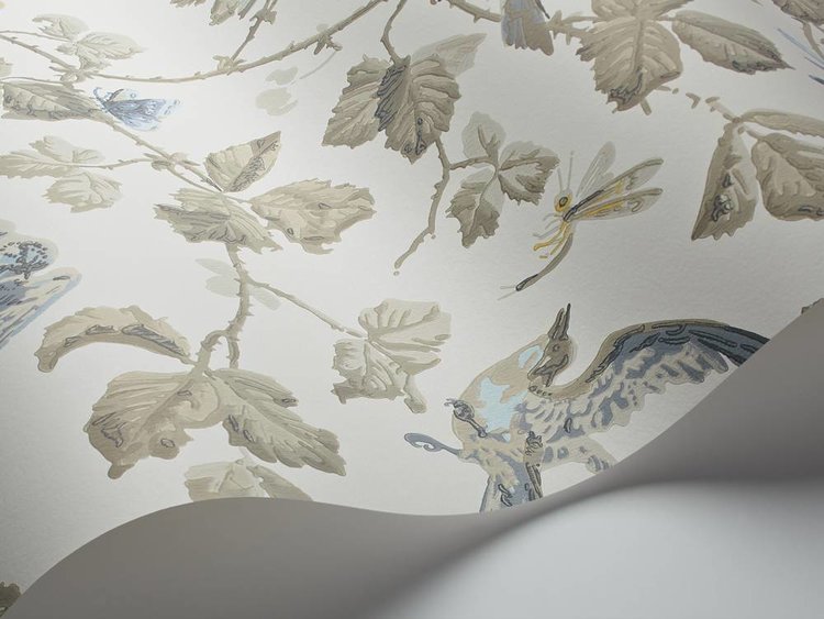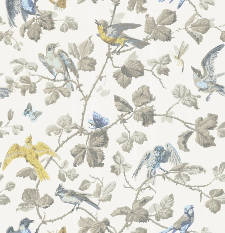 The historic wallpaper design Winter Birds was discovered hiding in the bottom of an archive drawer. This wonderful old print reveals garden birds perching amongst thorny briars and rose bushes. Coloured subtly in earthy tones of greys, olives, blues, and ochre.