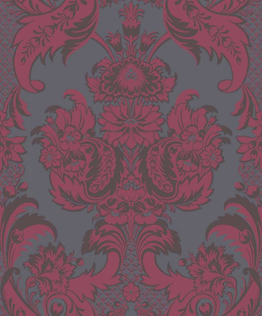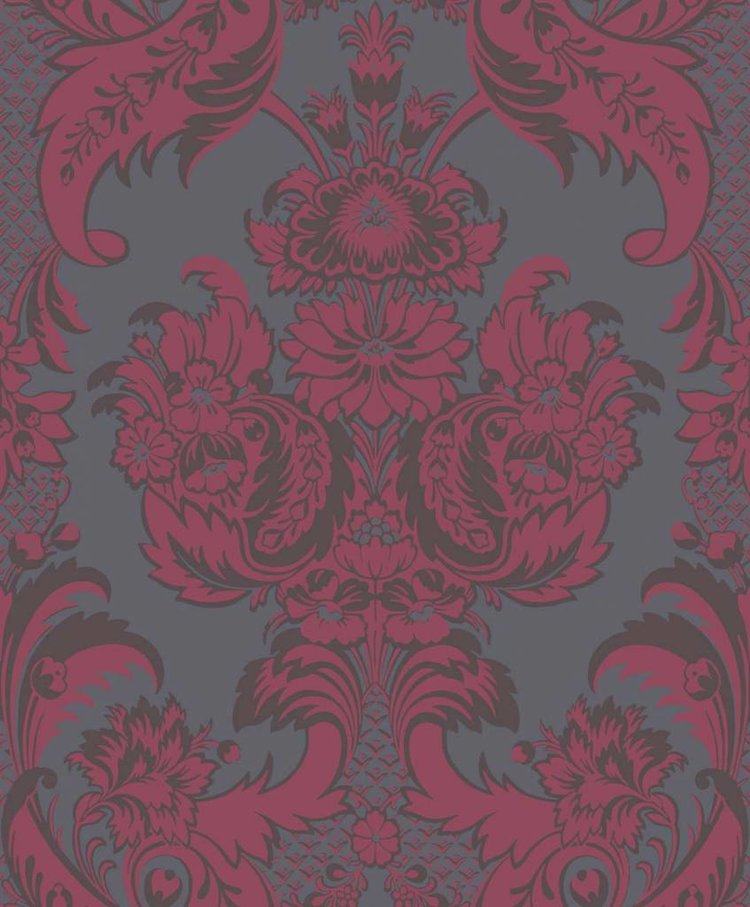 A stylish surface printed floral damask wallpaper in five luxurious colourways. This luxury wallpaper pattern has been cast in moody fashion tones of slate grey, peacock blue, old gold, carmine and pearly grey, Wyndham was inspired by the decorative mouldings and gilding on display in the London theatre of the same name.