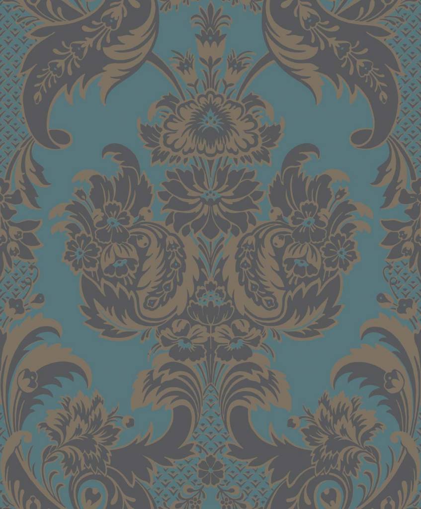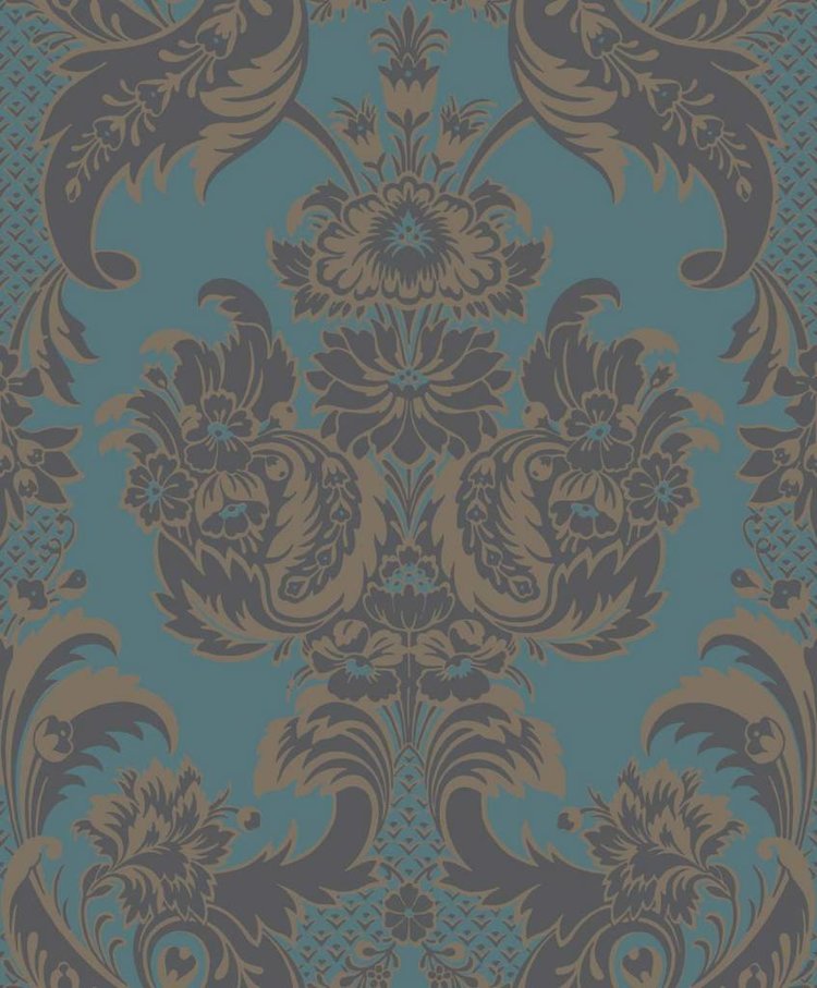 A stylish surface printed floral damask wallpaper in five luxurious colourways. This luxury wallpaper pattern has been cast in moody fashion tones of slate grey, peacock blue, old gold, carmine and pearly grey, Wyndham was inspired by the decorative mouldings and gilding on display in the London theatre of the same name.